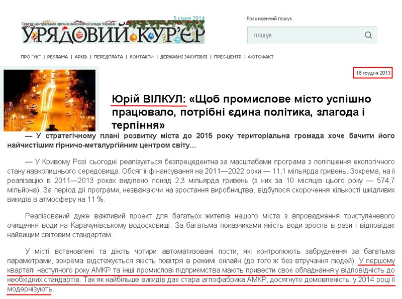 • Реализуется самая масштабная в Украине долгосрочная программа по решению экологических проблем Кривбасса и улучшению состояния окружающей природной среды на 2011-2022 годы. Объемы выбросов загрязняющих веществ в атмосферу уже сократились на 12%. Выбросы загрязняющих веществ в атмосферный воздух при осуществлении массовых взрывов сократились на 15%. (В 2013 году уменьшились среднегодовые концентрации по пыли на 29%, диоксида серы - 30%, оксид углерода - 33%, оксида азота - 25%, аммиака - 40%, формальдегида - 20%).