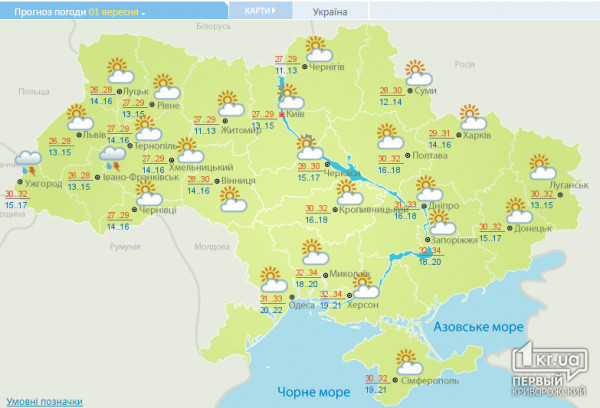 Ночью температура опустится до +21°. Утром термометры покажут +25°. В 12:00 температура поднимется до +35°. Вечером в Кривом Роге похолодает до +27°.