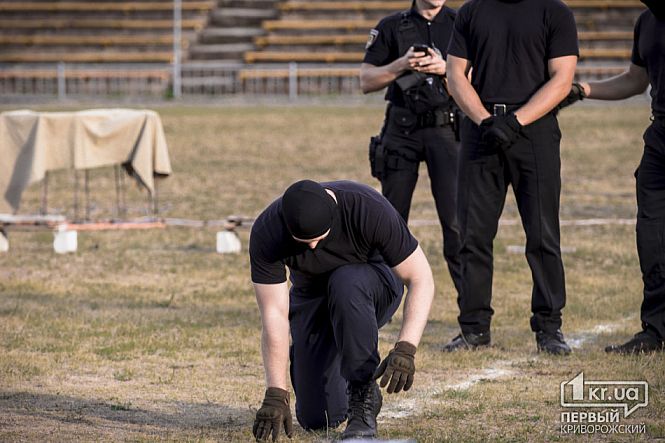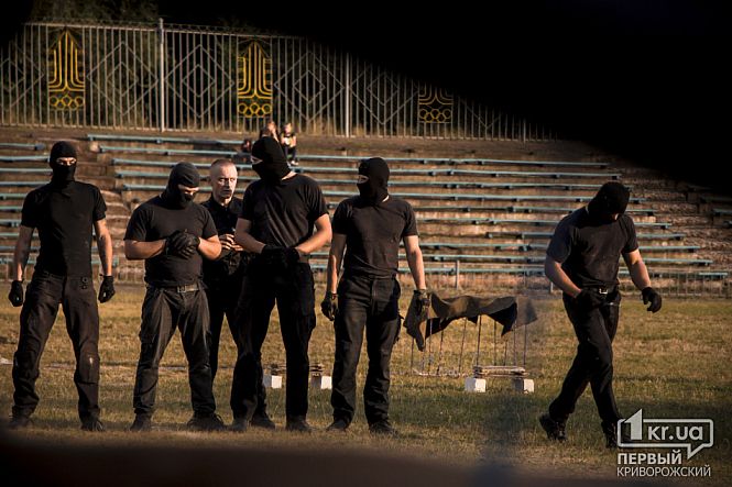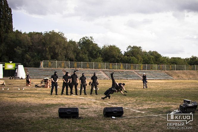 На стадионе ДЮСШ№10 в Кривом Роге во время мероприятия ко Дню Независимосты Укрианы тактическая группа Управления патрульной полиции Кривого Рога продемонстрировала жителям Саксаганского района комплекс приемов рукопашного боя.