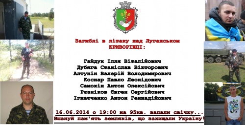 Криворіжці!Загинули наші земляки... 13.06.2014 під Луганськом було збито літак, на якому знаходились і криворізькі солдати!Хтось втратив друга, хтось чоловіка, хтось хлопця...Ми втратили найкращих патріотів нашого міста!Пропоную 16.06.2014 зібратись на 95кв о 19:00, взяти з собою свічки, і вшанувати пам'ять хвилиною мовчання...Без промов, без галасу, без суперечок...Хто згодний- прошу зробити максимальний репост!Слава Героям!