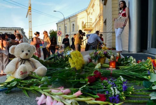 Украинцы в Киеве несут цветы свечки и детские игрушки под посольство Нидерландов