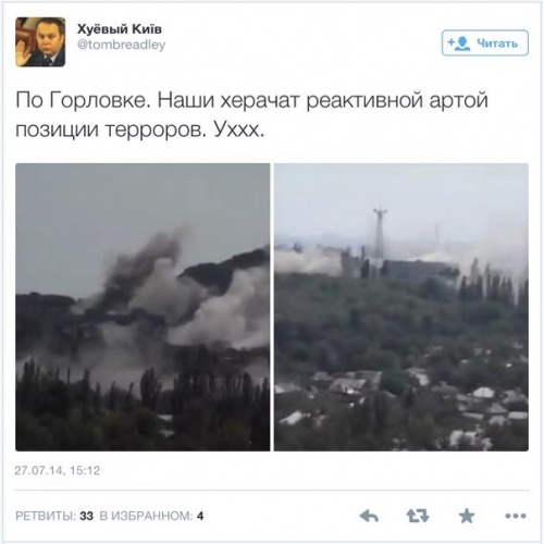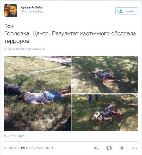"17 мирных жителей погибли в городе Горловка в 25 км к северо-востоку от Донецка 28 июля, сообщила администрация. Украинская армия несколько дней к ряду обстреливает Горловку из артиллерии. Снаряды взрываются днем в центре города. Пострадали районы Комсомолец, Бессарабка, Глубокое, рассказал очевидец.– Звоню из города Горловка. У нас творится ад. Днем без предупреждения открывают огонь со стороны Майорского поста – это со стороны Дзержинска. В центре все взрывается. Активный огонь из артиллерии военные начали в воскресенье, 27 июля. Никакого оповещения населения не было. Очень много снарядов попали в центральный парк. Пострадали жилые массивы Строитель, Комсомолец, Румянцево, Бессарабка. Много разрушенных домов в Румянцево. Потом в понедельник в 10 часов утра было два залпа, опять самый центр разбомбили. Жилые дома разрушены, в парке трупы валяются. Украинские телеканалы сообщают, что убиты три человека и стрельба ведется только ночью, – рассказал житель Горловки Антон К.По его словам, люди испытывают шок. Многие уезжают из города. Другие перегораживают дороги, умоляют на коленях, чтобы их вывезли. Кто-то собирает рюкзаки, идет по дороге пешком. Антон остается, поскольку не может забрать с собой родителей, которые живут в центре. Транспорт не ходит, и такси вызвать невозможно.– Поражает сам факт, что не предупреждают людей, что начинается обстрел. Раньше огонь вели по окраинам – это уже нормально воспринимается. Но днем, в часы, когда люди ходят по городу, по рынкам, – это трудно понять, это ужас, – говорит Антон.
