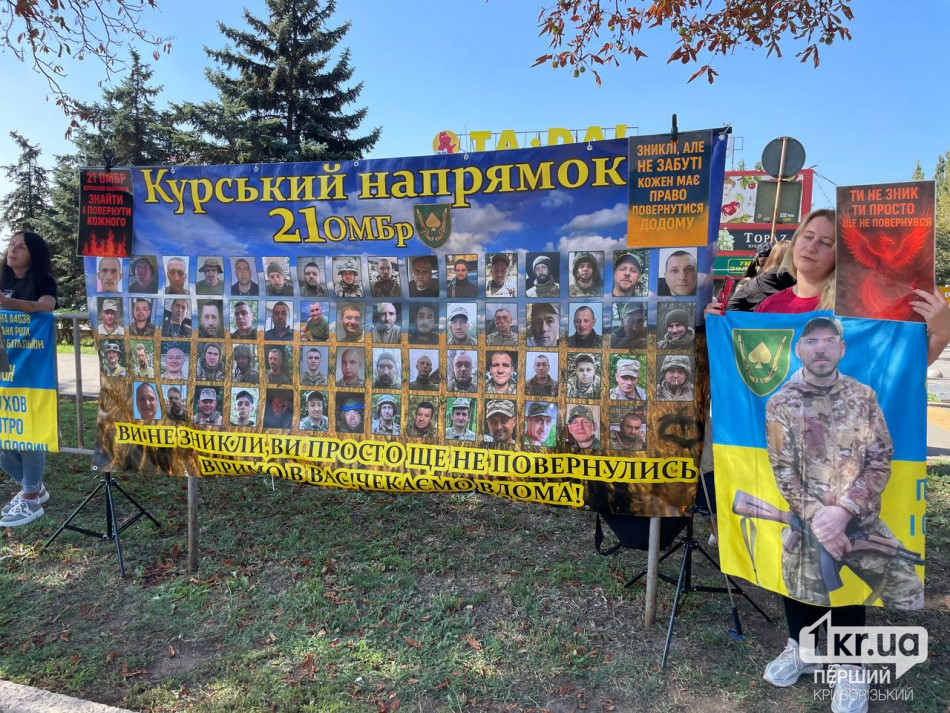 На великому банері "Курський напрямок 21 ОМБр" були розміщені фотографії десятків військових. Напис на банері гласив: "Вони зникли, ви просто не повернулися додому".