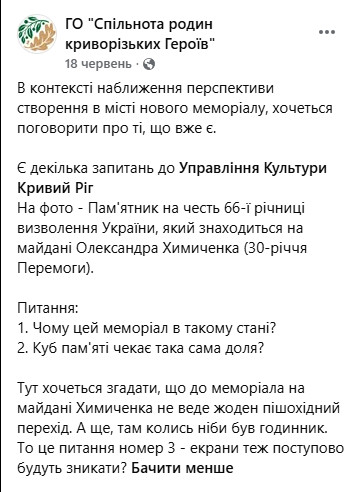 Попри те, що ремонти монументів, які увічнюють пам’ять про загиблих військовослужбовців часів Другої світової війни в Кривому Розі, проводять щорічно, деякі з них залишаються поза увагою місцевої влади. Так, учасники громадської організації «Спільнота родин криворізьких Героїв» помітили стан меморіалу на честь 66-ї річниці визволення України, що в Саксаганському районі міста на площі Олександра Химиченка (30-річчя Перемоги).
