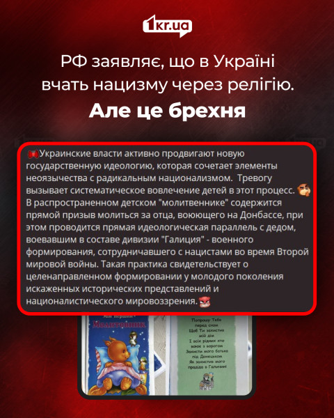 Ворожі ресурси публікують нібито сторінку з дитячого молитовника, де маленьких українців начебто вчать молитися за тата-військового, який воює у Донецькій області, порівнюючи його з «прадідом» із дивізії «Галичина».