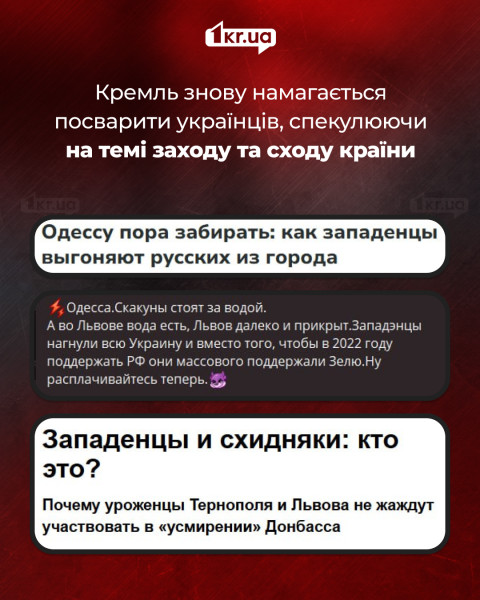 Цей самий наратив розкручується й у більших матеріалах російських медіа. У публікаціях про Одесу пропагандисти пишуть про нібито «масовий наплив агресивних вихідців із Західної України», які «утискають корінних одеситів», нав'язують мову й провокують конфлікти. Для «підтвердження» таких заяв використовують анонімні коментарі, вигаданих «місцевих жителів», а також одних і тих самих спікерів — російських депутатів, псевдоекспертів і колаборантів.