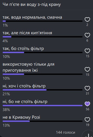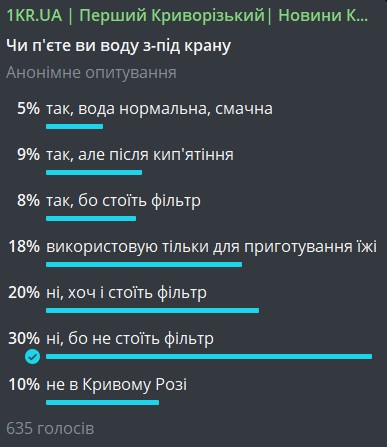 Редакція «Першого Криворізького» опитала містян у Telegram та Viber, чи вживають вони воду з-під крану. У ньому взяли участь понад 640 людей. Результати показали, що переважна більшість мешканців не п'ють таку воду, незалежно від наявності фільтра.