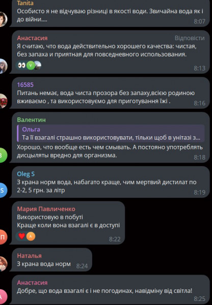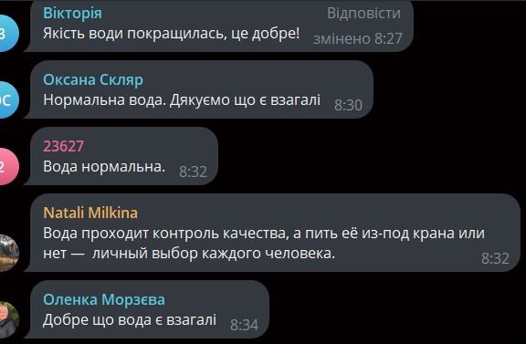 Також під цим опитуванням редакція вчергове помітила незвичну активність у коментарях. Упродовж короткого часу користувачі почали залишати однотипні повідомлення, на кшталт: «Питань немає, вода чиста прозора без запаху, всією родиною вживаємо , та використовуємо для приготування їжі», «Добре, що вода взагалі є і не по годинах», «Нормальна вода».