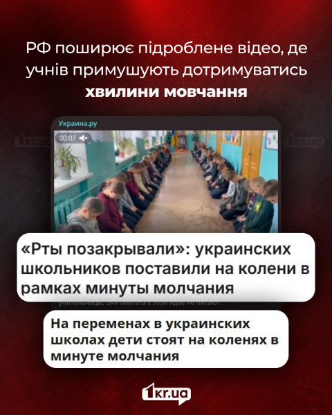 Проросійські сайти та телеграм-канали масово поширюють відео, яке нібито зняте в «одній з українських шкіл». У дописах йдеться, що під час загальнонаціональної хвилини мовчання дітей нібито ставлять на коліна просто на шкільних перервах, а вчителька «в істериці» кричить на учнів і змушує їх мовчки «горювати».