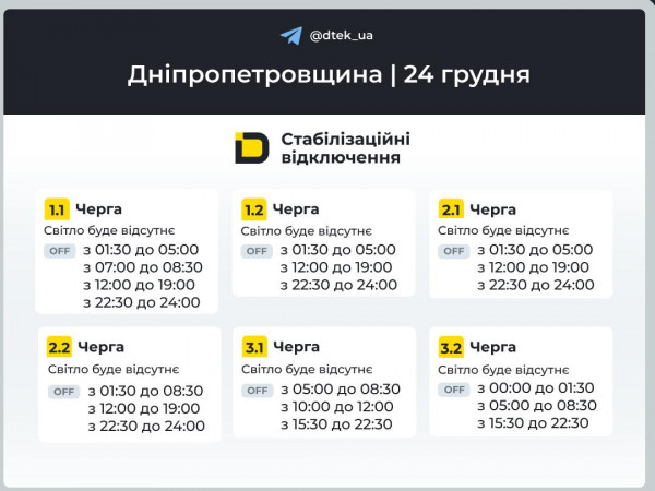 - черга 1.2 — 12:00-19:00; 22:00-24:00;