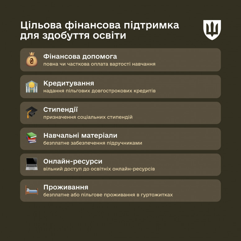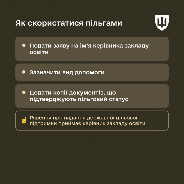 Діти ветеранів війни, а також діти військових із інвалідністю, які навчаються на денній формі, отримують державну цільову підтримку до 23 років.