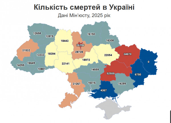 Проте не всюди динаміка однакова. Поменшало смертей на Полтавщині та Рівненщині: — 4%. Водночас у 6 регіонах смертність зросла, найбільше — у Києві, де показник збільшився на 2%. Зростання також зафіксовано у Чернівецькій (+1,6%), Черкаській (+1%), Івано-Франківській (+0,9%), Тернопільській (+0,6%) та Львівській (+0,4%) областях.