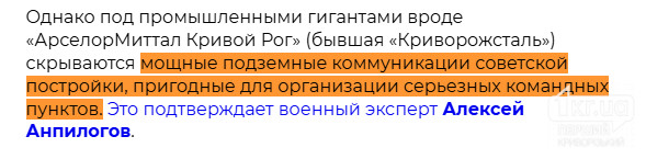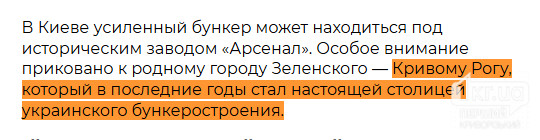 Особливу увагу російські медіа приділяють Кривому Рогу, називаючи його:«настоящей столицей украинского бункеростроения».