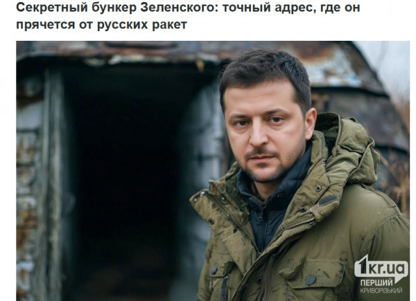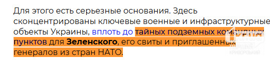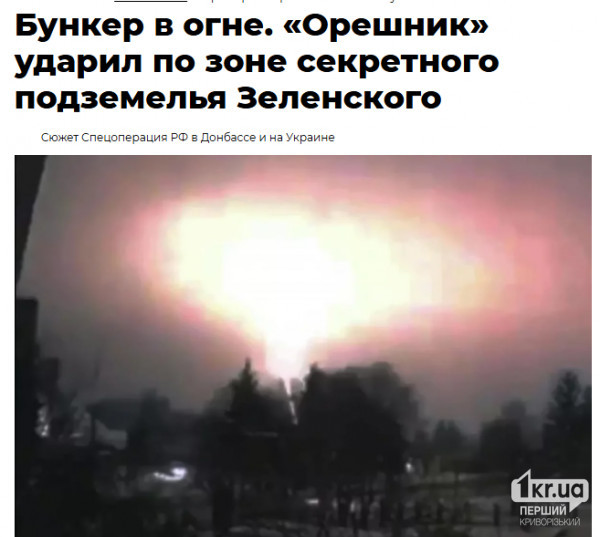 Черговим прикладом стала публікація з гучним заголовком:«Російський Орешник вдарив по зоні секретного підземелля Зеленського».