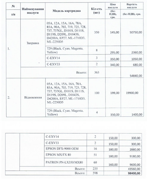 Згідно з договором, вартість послуг становить 98,4 тисячі гривень без ПДВ. У калькуляції зазначено, що протягом року планують заправити картриджі 363 рази та ще 235 разів відновити. Загалом це 598 операцій із картриджами на рік.