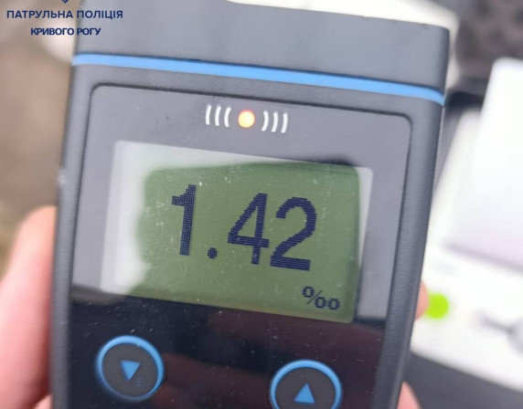 На вимогу інспекторів водій погодився пройти огляд на визначення стану алкогольного сп’яніння на місці зупинки транспортного засобу за допомогою газоаналізатора Драгер. Результат огляду позитивний та склав — 1,42 проміле.