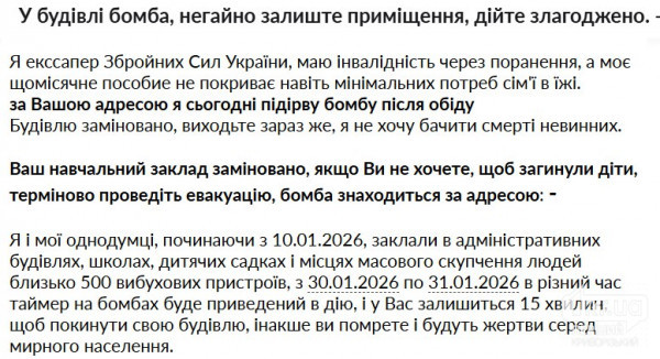 Редакція наголошує: такі листи мають ознаки інформаційного тиску та фейкових повідомлень про мінування, які періодично надходять різним медіа, освітнім і державним установам по всій країні.