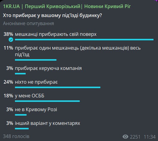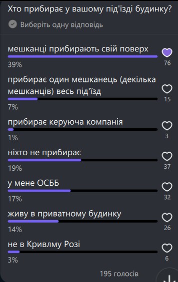 Редакція «Першого Криворізького» також провела опитування серед читачів і читачок щодо того, хто фактично прибирає під'їзди у їхніх будинках.