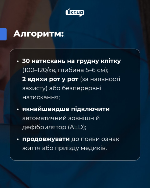 - 30 натискань на грудну клітку (100–120/хв, глибина 5–6 см);2 вдихи рот у рот (за наявності захисту) або безперервні натискання;
