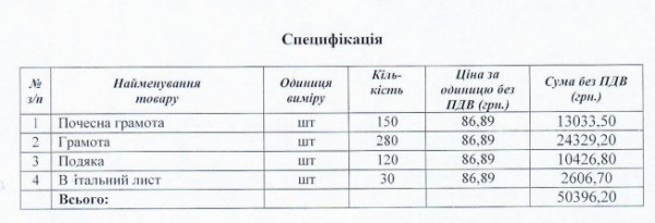 - 650 грамот виконкому (вартість бланка - 109 грн, рамки - 273 грн)