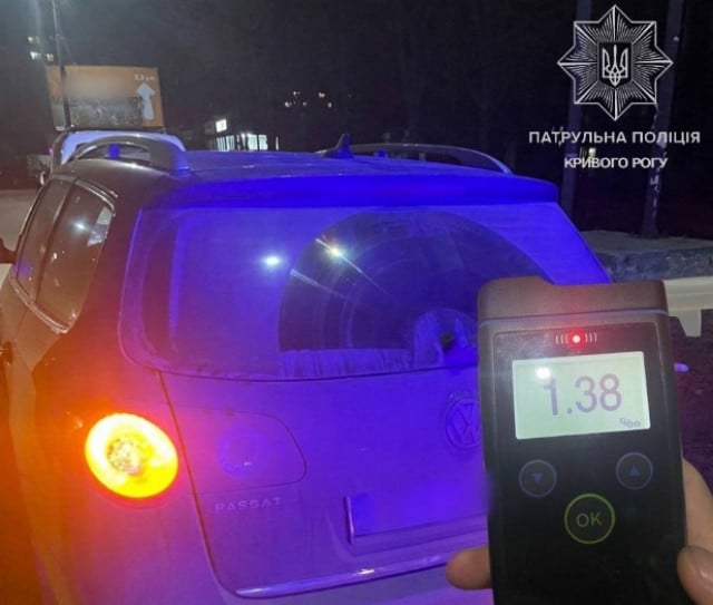 У Саксаганському районі зупинили автомобіль Volkswagen за порушення правил дорожнього руху. Водій за кермом мав ознаки алкогольного сп’яніння. Результат освідування за допомогою Drager показали в крові 1,38 проміле алкоголю.