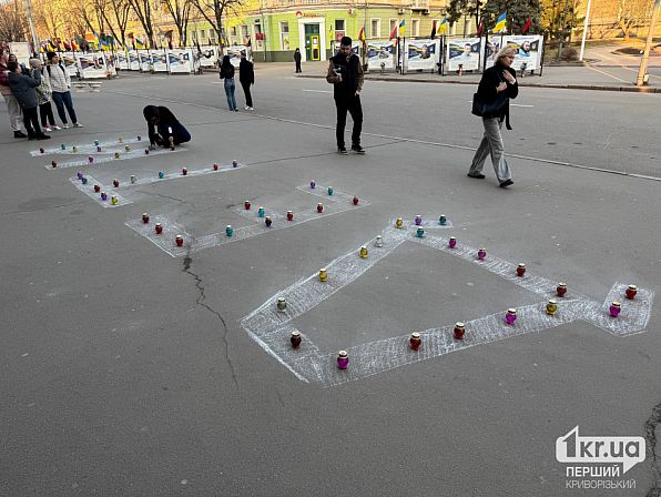 На площі виклали лампадки у символічні написи, що нагадують про події березня 2022 року, коли російська авіація скинула бомбу на будівлю театру в Маріуполі. У той час там переховувалися сотні мирних жителів, серед яких були жінки та діти.