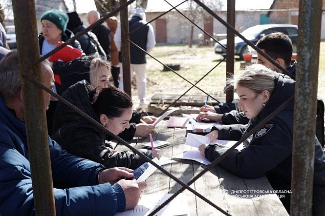 На одному зі знімків видно, як люди разом із правоохоронцями оформлюють документи щодо пошкодженого майна.