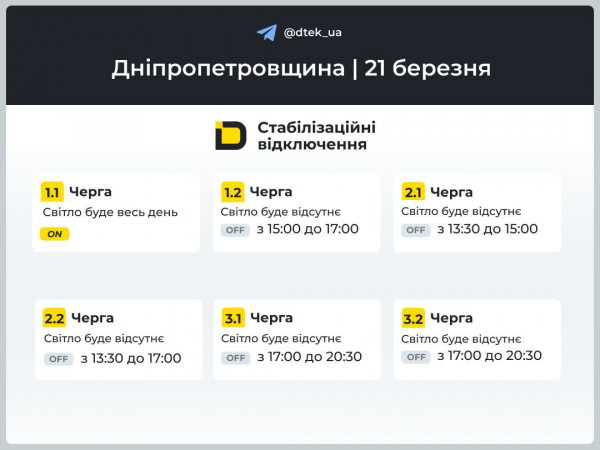 Графік відключень світла ДТЕК на 21 березня: