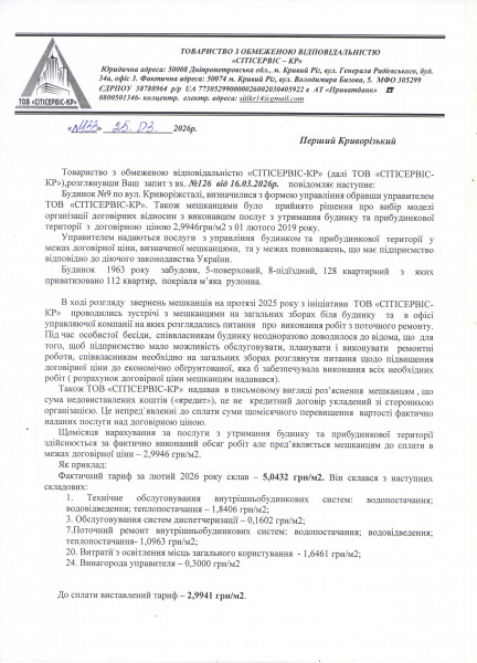 Як приклад, фактичний тариф за лютий 2026 року склав – 5,0432 грн/м2. Він складався з наступних складових:
