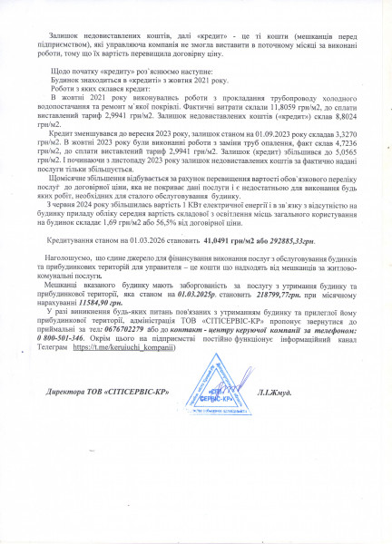 - для того, щоб у «Сітісервіс-КР» мали можливість обслуговувати, планувати та виконувати ремонтні роботи, співвласникам необхідно на загальних зборах розглянути питання щодо підвищення договірної ціни до економічно обґрунтованих, яка б забезпечувала виконання всіх необхідних робіт;