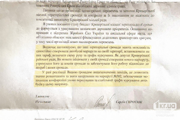 У разі реалізації Вашою громадою вищезазначених заходів, це дозволить значно розвантажити та зняти напруження на маршруті №302, забезпечивши мешканцям комфортніші умови пересування та стабільний графік курсування автобусів у цьому напрямку», — йдеться у офіційній відповіді на депутатське звернення за підписом начальника управління транспорту та телекомунікацій виконавчого комітету Криворізької міської ради Сергія Сиротюка.