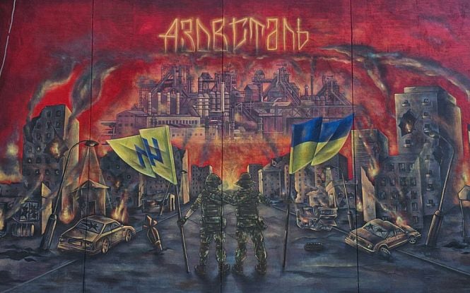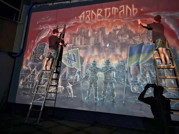 На муралі зображені військові, які стоять спиною і дивляться у бік «Азовсталі».