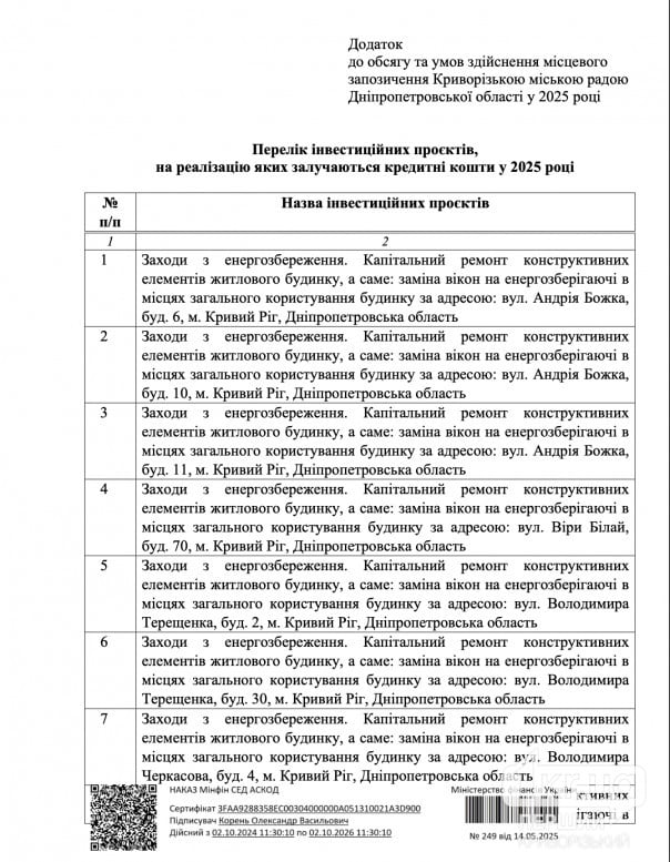 Після порівняння цього переліку зі списком інвестиційних проєктів, на реалізацію яких у 2025 році залучили кредитні кошти, виявилося, що всі 199 адрес збігаються.