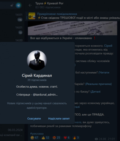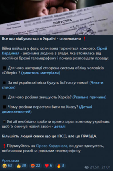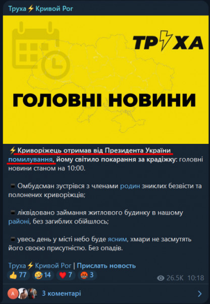 Так, нещодавно в телеграм-каналі «Труха. Кривой Рог» опублікували рекламу невідомого телеграм-каналу, який має мало підписників, а в його шапці виднілася фраза «Особиста думка, новини, статті». Тобто цей канал ще й пропагує неперевірені джерела інформації, які можуть ввести в оману читачів.