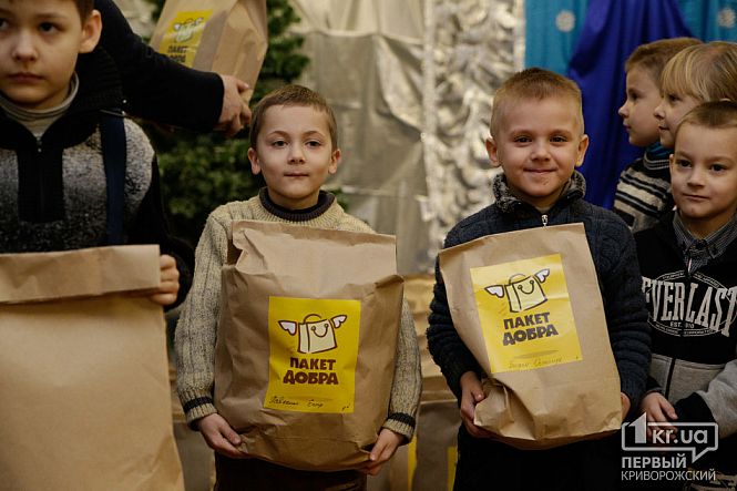 В Кривом Роге 15-го января детям со школы-интерната вручили "Пакеты добра". Люди, которые хотели помочь детям, на протяжении двух недель собрали около 600 пакетов с адресными подарками.